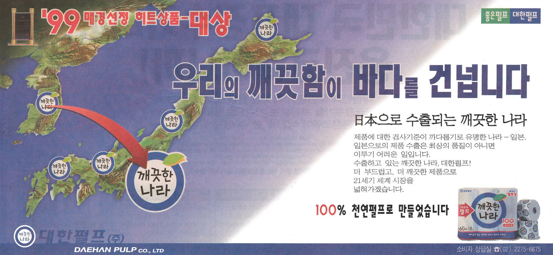 대한펄프 1999년 매경 선정 히트상품 대상 기념 일본 수출 광고(매일경제, 1999. 12. 10) 이전글 2006 비데후엔 잡지광고(0502) 다음글 기업 이미지 광고(매일경제, 1997. 3. 24) 목록