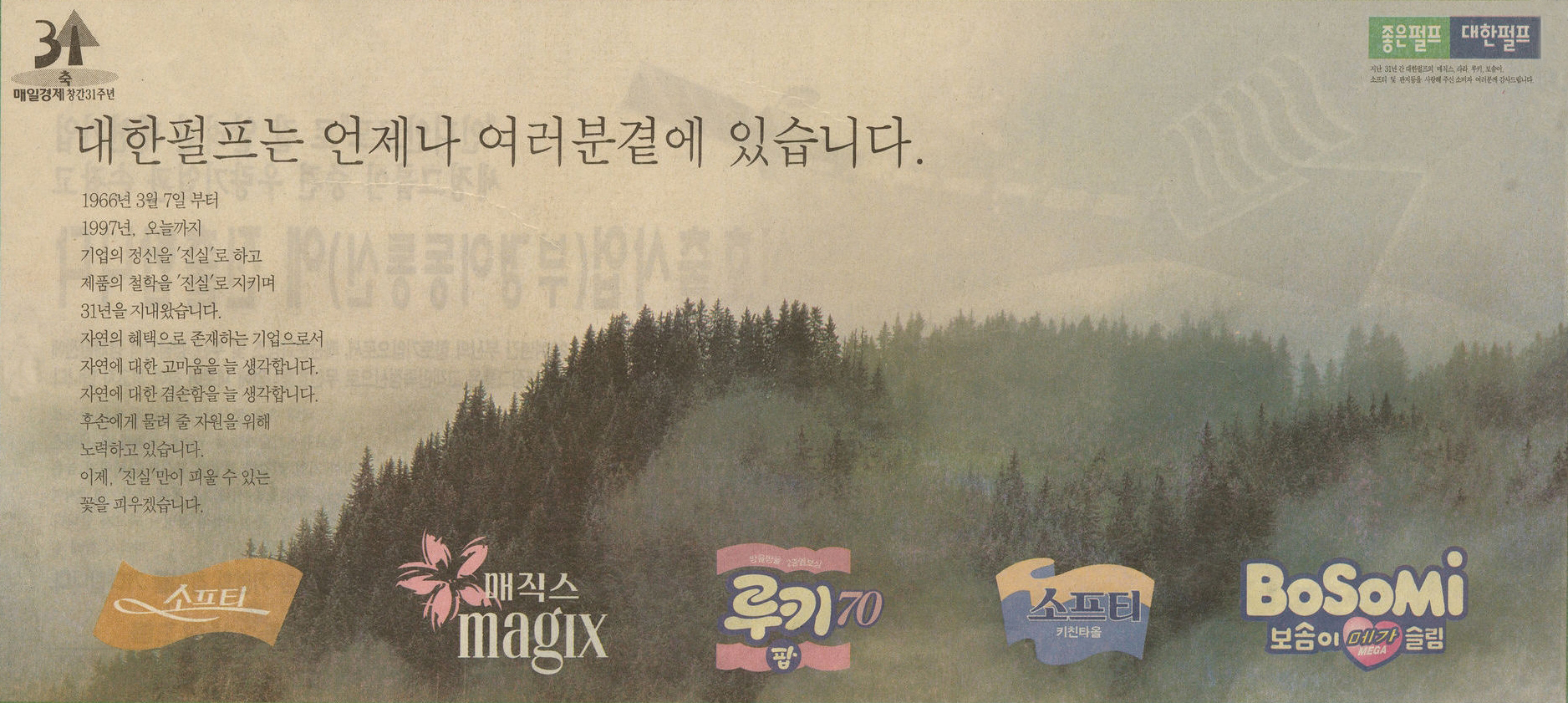 대한펄프 기업 이미지 광고(매일경제, 1997. 3. 24) 이전글 1999년 매경 선정 히트상품 대상 기념 일본 수출 광고(매일경제, 1999. 12. 10) 다음글 소프티 광고(조선일보, 1997. 3. 10) 목록