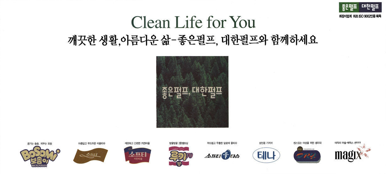 대한펄프 화장지 업계 최초 iso 9002 인증 획득 기념 광고(매일경제, 1995. 11. 4) 이전글 창립 30주년 기념 광고(매일경제, 1996. 3. 7) 다음글 1994-1995 2년 연속 환경관리모범업체 광고(매일경제, 1995. 3. 24) 목록