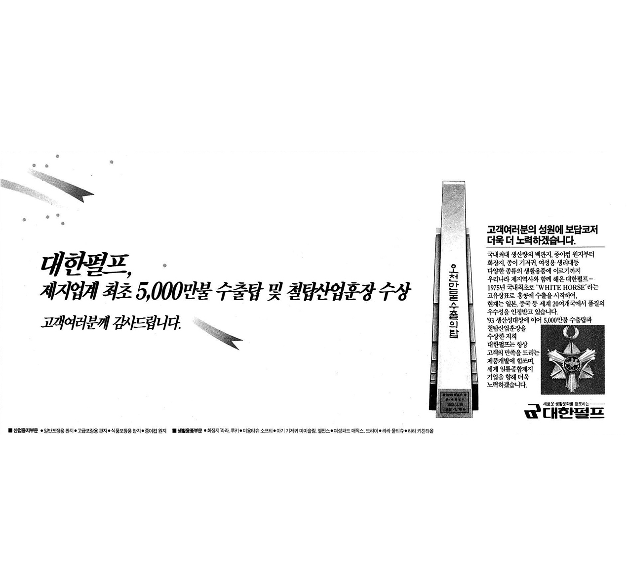 5천만불 수출탑 수상 기념 광고(매일경제, 1993. 12. 1)