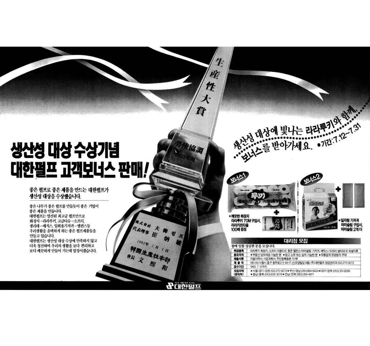 1993년 생산성대상 수상 기념 고객 보너스 판매 광고(경향신문, 1993. 7. 27)