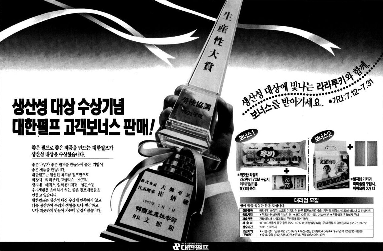 대한펄프 1993년 생산성대상 수상 기념 고객 보너스 판매 광고(경향신문, 1993. 7. 27) 이전글 5천만불 수출탑 수상 기념 광고(매일경제, 1993. 12. 1) 다음글 종이컵 재활용 광고(조선일보, 1992. 10. 7) 목록