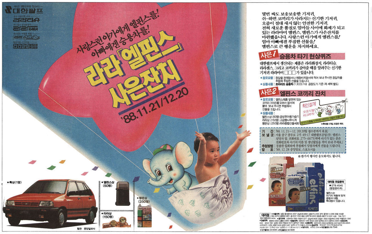 대한펄프 라라엔핀스 사은잔치 광고(동아일보, 1988. 12. 13) 이전글 엘핀스 탑슬림 광고(동아일보, 1989. 11. 11) 다음글 라라 마미 엘핀스 광고(동아일보, 1988. 10. 26) 목록