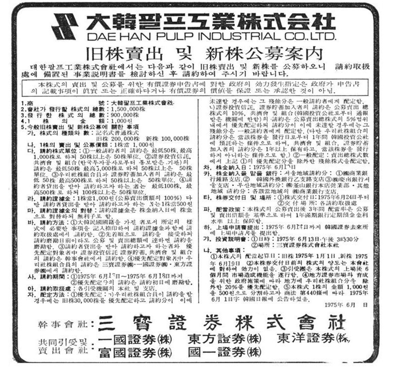 대한팔프공업 주식청약 공고(경향신문, 1975. 6. 9)
