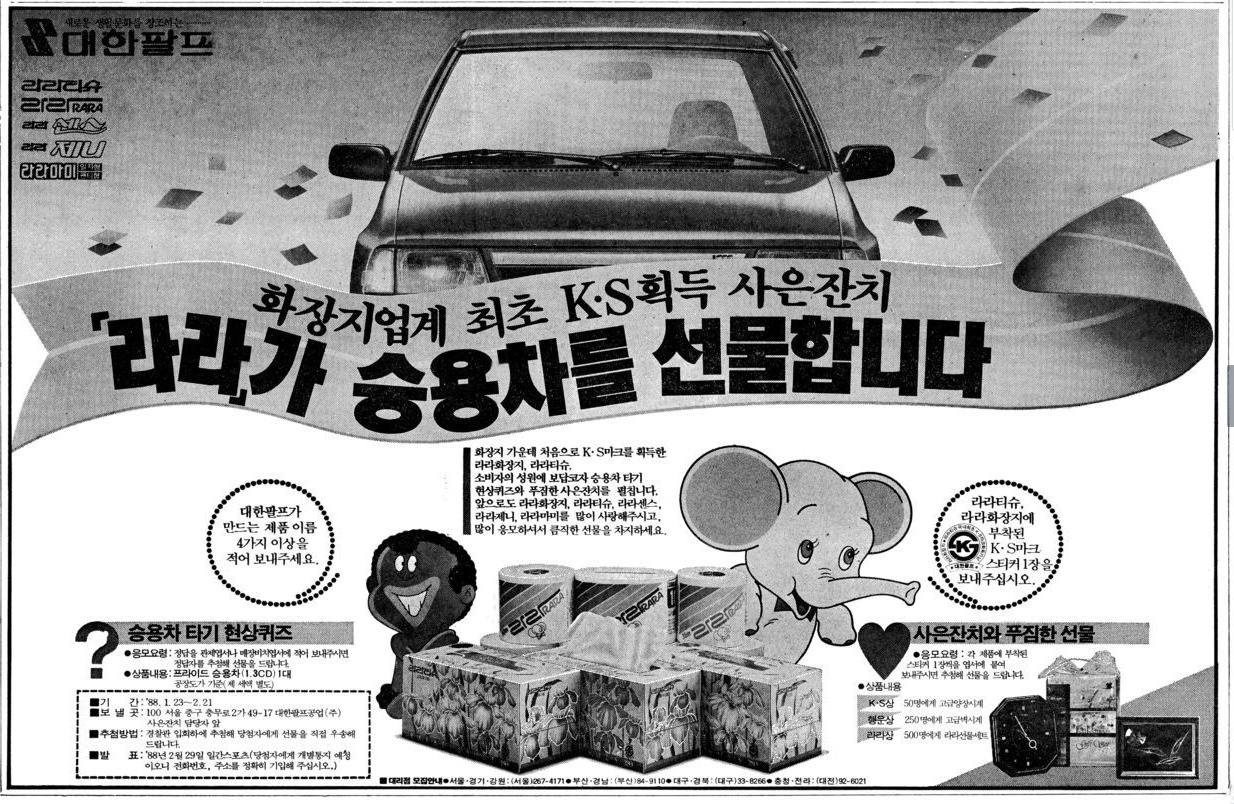 대한펄프 화장지 업계 최초 KS획득 사운잔치 광고(동아일보, 1988. 1. 18) 이전글 라라 마미 엘핀스 광고(동아일보, 1988. 10. 26) 다음글 라라 티슈 탄생 광고(동아일보, 1986. 9. 27) 목록
