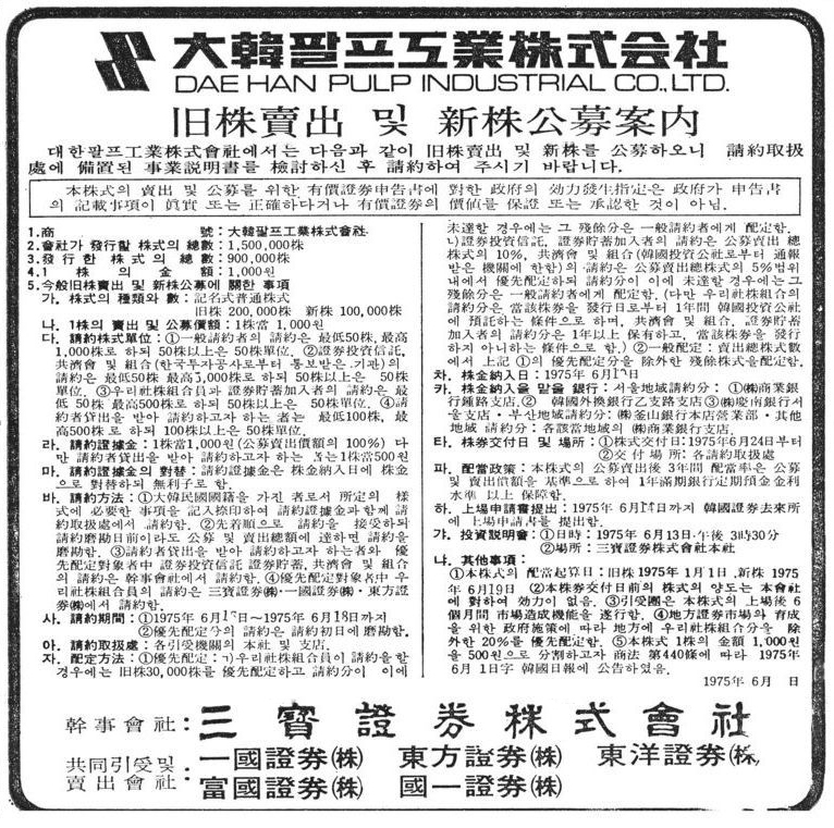대한펄프 대한팔프공업 주식청약 공고(경향신문, 1975. 6. 9) 이전글 라라탄생 광고(동아일보, 1986. 3. 22) 다음글 대한팔프공업 2호기 준공 광고(경향신문, 1973. 11. 9) 목록